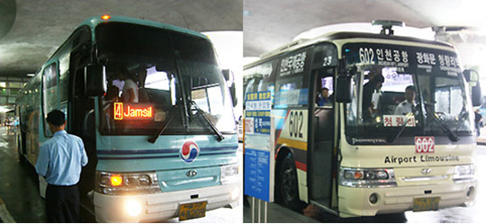 There are two types of airport buses: deluxe and standard. Deluxe buses are KAL limousines and other bus companies that over non-stop or shortened routes to major hotels and destinations. These buses make fewer stops (shorter travel time) and have comfortable seats with more space. Standard buses tend be more crowded with smaller space and make more stops.