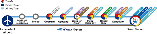 The Airport Railroad Express (AREX) has two lines: the nonstop express line from Incheon International Airport to Seoul Station and the commuter line that services 10 subway stations.